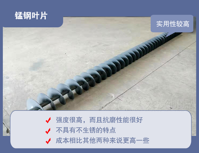 錳鋼螺旋輸送機(jī)葉片的強(qiáng)度很高,而且抗磨性能很好,主要是由于錳鋼的錳元素,而錳鋼不具有不生銹的特點(diǎn),與錳鋼相比,不銹鋼的抗氧化性能以及耐腐蝕性能就很好了,但是強(qiáng)度沒(méi)有錳鋼好。