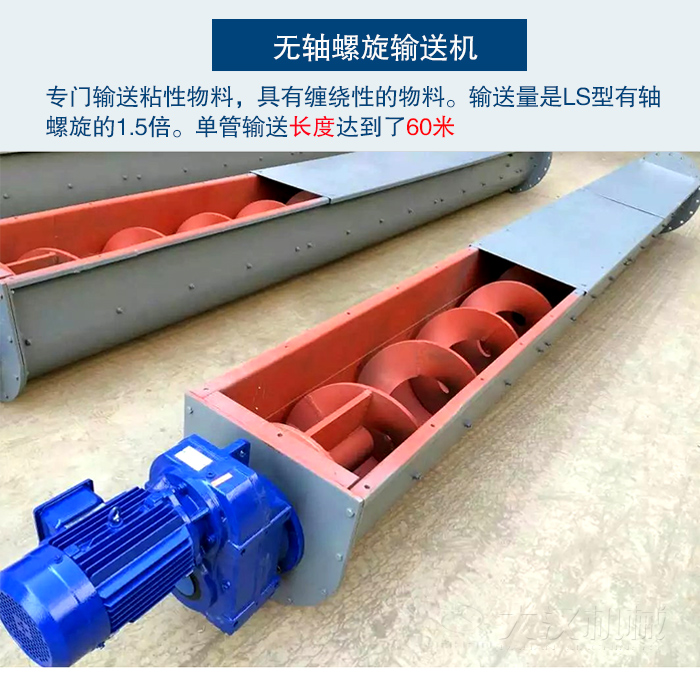 無軸螺旋輸送機又是,在LS型螺旋輸送機的基礎(chǔ)上進行改進的。由于LS型螺旋輸送機結(jié)構(gòu)所以無法輸送一些,有粘性和纏繞性的物料。所以就出現(xiàn)了無軸螺旋輸送機。因此無軸螺旋輸送機就成為了專門輸送一些,粘性物料,具有纏繞性的物料。無軸螺旋輸送機不僅在物料上有所突破,在輸送量上也超過了LS型有軸螺旋的1.5倍。并且單管輸送長度達到了60米的輸送距離。