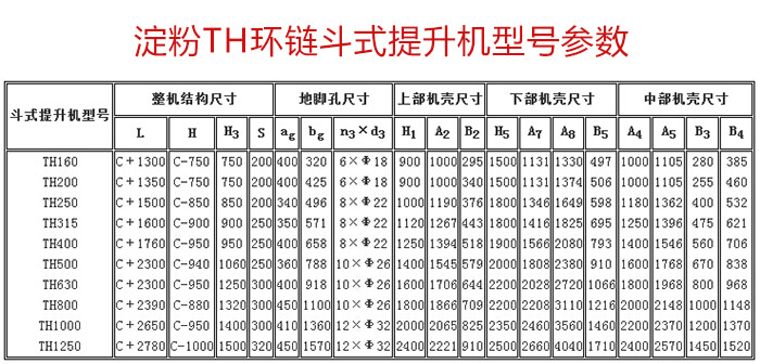 粉TH環鏈斗式提升機型號有TH160、TH250 、 TH315、TH400 、TH500等。同時大漢機械支持產品特殊定做,根據您的要求為您定制出合適的設備!