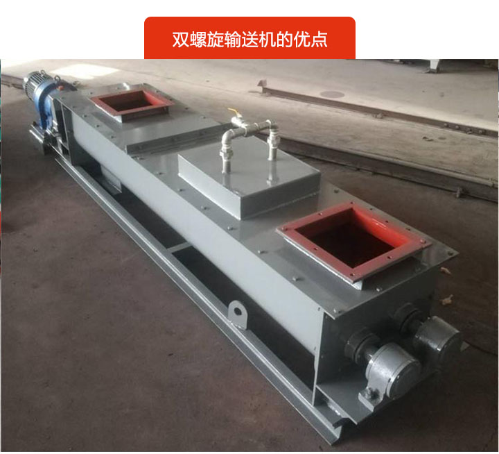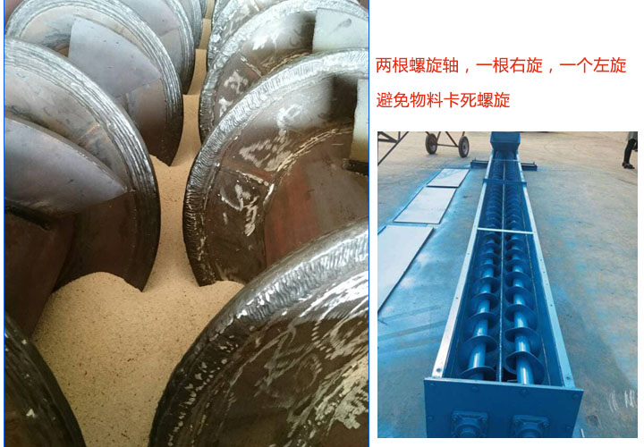 雙螺旋輸送機(jī)擁有兩根螺旋軸,旋轉(zhuǎn)方向相反(一根右旋,另一個左旋),能有效避免物料卡死螺旋,輸送中不會出現(xiàn)卡料和堵料的現(xiàn)象。