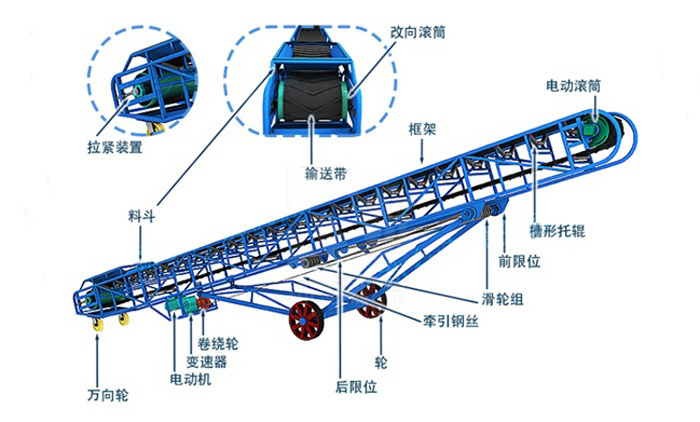 帶式輸送機(jī)主要由輸送帶、驅(qū)動(dòng)裝置、滾筒、托輥、張緊裝置、清掃裝置等組成。輸送帶是輸送機(jī)的主體部件,用于承載物料并傳遞動(dòng)力。驅(qū)動(dòng)裝置通常包括電動(dòng)機(jī)、減速器和聯(lián)軸器,提供動(dòng)力驅(qū)動(dòng)輸送帶運(yùn)行。滾筒用于支撐和傳遞輸送帶的運(yùn)動(dòng)力,托輥支撐輸送帶并減少摩擦。張緊裝置用于調(diào)整輸送帶的張緊度,保持適當(dāng)?shù)膹埩ΑG鍜哐b置用于清除輸送帶上的雜物,保持輸送帶清潔。這些組成部分協(xié)同工作,使帶式輸送機(jī)能夠高效、穩(wěn)定地完成物料的輸送任務(wù)。